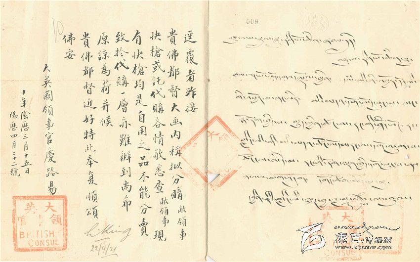 可以肯定的是,這就是給某位活佛的復信,除了稱呼佛都督(這是在當時對活佛的通行的敬稱)可以看出外,還有藏文可以佐證。這張紙片上寫道:昨接貴佛都督大函,內(nèi)稱,擬分購敝領事館快槍或托代購各情敬悉。查敝領事現(xiàn)有快槍均是自用之品,不能分賣。致于代購一層,亦難辦到,尚希原諒為荷,并候貴佛都督近好,特此奉復,順頌佛安。署名是大英國領事館官慶路易,日期為十年陰歷三月十五日,陽歷四月二十二日。在公章下面注有公元1922年4月22日。