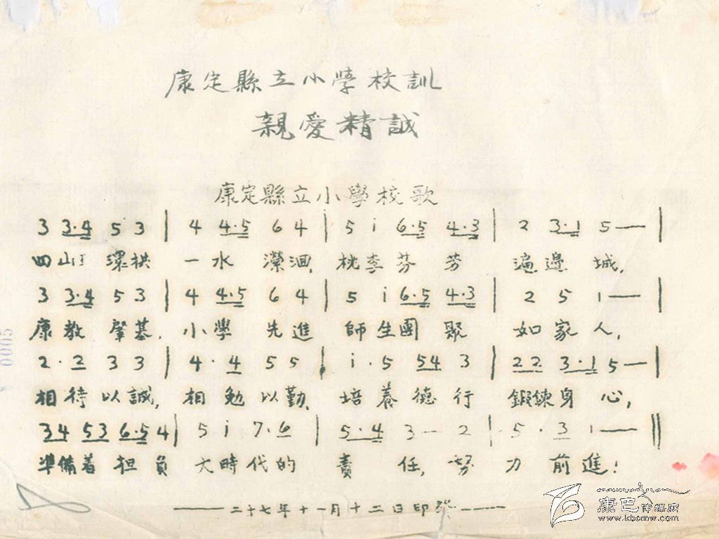 在眾多的民國教育檔案中,關(guān)于西康省各地學(xué)校的學(xué)生花名冊、學(xué)生成績表、學(xué)校經(jīng)費(fèi)運(yùn)用情況,以及教職工領(lǐng)取工薪的領(lǐng)條和表格等等有相當(dāng)大的一部分。難得的是,在這些檔案中竟然出現(xiàn)了兩份“歌譜”。細(xì)看卻不只是“歌譜”,而是兩所小學(xué)把自己學(xué)校的“校訓(xùn)”寫成的“校歌”。其中,一份是康定縣立小學(xué)依據(jù)校訓(xùn)“親愛精誠”寫成的校歌,另一份是日地短期小學(xué)依據(jù)校訓(xùn)“智仁勇”寫成的校歌。通過這兩份“校歌”,可以看到當(dāng)時(shí)小學(xué)教育已經(jīng)較為正軌,還開設(shè)有音樂課。“校歌”的內(nèi)容積極向上,充盈現(xiàn)在所說的“正能量”,鼓勵學(xué)生努力學(xué)習(xí),成為有擔(dān)當(dāng)?shù)娜恕?/div>