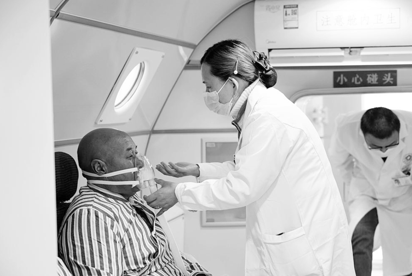 圖為患者在高壓氧艙治療室吸氧。