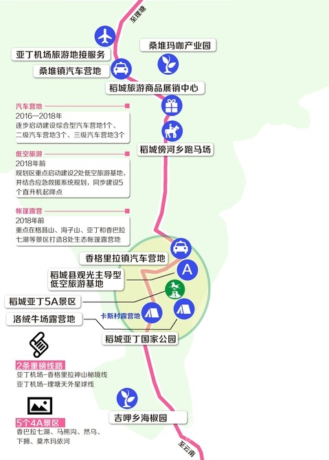 根據(jù)《規(guī)劃》,將結合道路交通和旅游景區(qū)景點分布,2016—2018年,逐步啟動建設綜合型汽車營地1個、二級汽車營地3個、三級汽車營地3個,作為建設環(huán)亞丁兩小時旅游圈的重要旅游項目,滿足日益增長的自駕車游客需求。