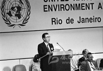 1992 年 6月12日,李鵬同志在聯(lián)合國環(huán)境與發(fā)展大會(huì)首腦會(huì)議上發(fā)言。 新華社記者 李生南 攝