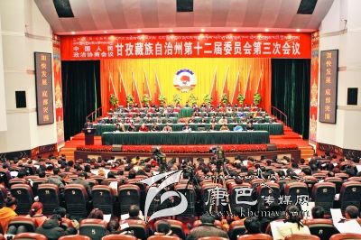 在主席團(tuán)前排就坐的有州政協(xié)主席易凡,州政協(xié)副主席劉昌澤、范文華、甲登·洛絨向巴、周冬秀、多吉扎西、蔣秀英、趙斌、楊學(xué)康,州政協(xié)秘書長劉勇。大會(huì)由大會(huì)秘書長、州政協(xié)常務(wù)副主席劉昌澤主持。