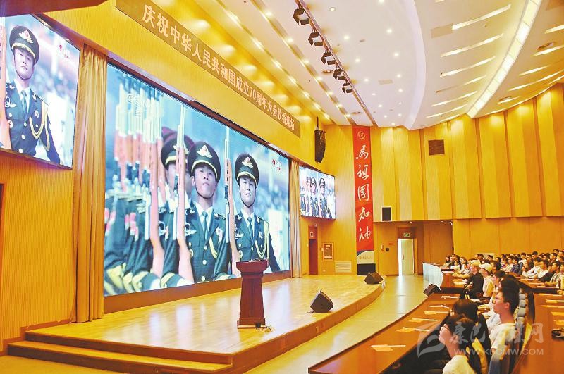 舉行升旗儀式、“快閃”合唱后,成都理工大學幾千名學子在食堂、報告廳集體觀看了直播,“太帥了!”“祖國太強大了!”軍人的颯爽英姿、先進的軍事武器引來同學們陣陣贊嘆。