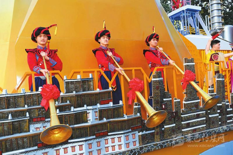 當(dāng)天中午12時(shí)25分,四川彩車緩緩駛?cè)胩彀查T核心檢閱區(qū)。金山銀山、新能源頁(yè)巖氣開發(fā)、核電技術(shù)華龍一號(hào)、金沙太陽(yáng)神鳥圖案、“四水澤川”的江流……映入眼簾的四川彩車造型大方雅致、色彩明快熱烈,音樂(lè)、茶藝、舞蹈和雕塑結(jié)合,傳遞出一股震撼人心的力量。行進(jìn)至檢閱區(qū),左右兩側(cè)的展演人員微笑揮手,手執(zhí)彝族長(zhǎng)號(hào)的小伙由下向上,將號(hào)頭仰天直對(duì)車頭,傳達(dá)出四川兒女對(duì)祖國(guó)的祝福。