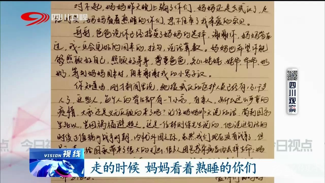 “媽媽還是騙了你,去了武漢,走的時(shí)候看到你們還在熟睡,忍不住親了我親愛的寶貝。哥哥,爸爸說你已經(jīng)接受了***選擇,謝謝你,媽媽答應(yīng)過我一定會(huì)完好的回來的,拉鉤,說話算話……”