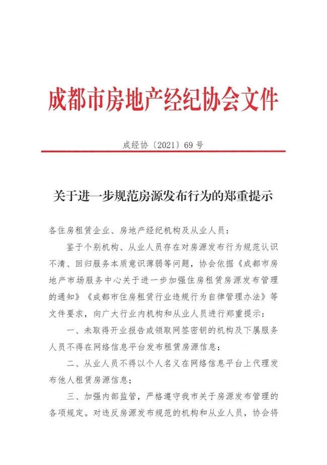第三,加強內(nèi)部監(jiān)管,嚴格遵守成都市關(guān)于房源發(fā)布管理的各項規(guī)定。對違反房源發(fā)布規(guī)范的機構(gòu)和從業(yè)人員,該協(xié)會將依據(jù)行業(yè)自律規(guī)范文件予以相應懲戒。