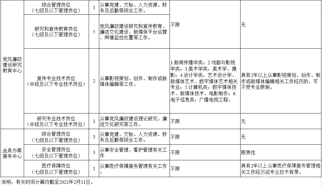 考調(diào)名額 考調(diào)事業(yè)人員25名。其中,信息技術(shù)中心管理崗位9名,黨風(fēng)廉政建設(shè)研究教育中心管理崗位6名、專業(yè)技術(shù)崗位3名,金泉辦案服務(wù)中心管理崗位7名。 考調(diào)對象及條件 考調(diào)對象 全省范圍內(nèi)行政單位或參公事業(yè)單位一級主任科員(含)以下職級及相當(dāng)職務(wù)層次人員;縣級及以上公益一類或全額撥款事業(yè)單位管理崗位七級及以下職員、專業(yè)技術(shù)崗位中級及以下工作人員。 考調(diào)條件 具有良好的政治素質(zhì)、專業(yè)素養(yǎng),品行端正,實(shí)績突出,群眾公認(rèn)。 中共黨員。 全日制大學(xué)本科及以上學(xué)歷,并取得相應(yīng)學(xué)士及以上學(xué)位。 年齡35周歲以下(1986年2月11日及以后出生)。 歷年年度考核均為合格(稱職)及以上。 身體心理健康,具有正常履行職責(zé)的身體條件和心理素質(zhì)。 符合報(bào)考崗位規(guī)定的資格條件,詳見《中共四川省紀(jì)委四川省監(jiān)委2022年公開考調(diào)事業(yè)人員崗位情況表》(附后)。 符合法律、法規(guī)規(guī)定的其他條件。 有關(guān)時(shí)間計(jì)算均截至2022年2月11日。 具有下列情形之一的,不得報(bào)考: 被依法列為失信聯(lián)合懲戒對象的。 涉嫌違紀(jì)違法正在接受有關(guān)專門機(jī)關(guān)審查尚未作出結(jié)論的。 受過黨紀(jì)政務(wù)處分或司法機(jī)關(guān)刑事處罰的。 受到誡勉、組織處理等影響期未滿或期滿影響使用的。 按照有關(guān)規(guī)定,到定向單位工作未滿服務(wù)年限或有其他限制性規(guī)定的。 尚在試用期的。 按照相關(guān)規(guī)定應(yīng)當(dāng)回避的。 法律、法規(guī)規(guī)定的其他情形。 報(bào)名及打印準(zhǔn)考證 2022年2月22日上午8:00至2月26日下午18:00,報(bào)名人員登錄四川省人力資源和社會(huì)保障廳官網(wǎng)(http://rst.sc.gov.cn/)首頁“人事考試”專欄進(jìn)行網(wǎng)上報(bào)名,每人限報(bào)一個(gè)崗位。 對報(bào)名人員進(jìn)行網(wǎng)上資格初審,通過資格初審者可于2022年3月1日上午8:00至3月2日下午18:00,登陸報(bào)名系統(tǒng)打印筆試準(zhǔn)考證。 考試 考試分筆試和面試。其中,信息技術(shù)崗位A、信息技術(shù)崗位B、宣傳專業(yè)技術(shù)崗位需加試專業(yè)測試。 根據(jù)筆試情況,擇優(yōu)確定進(jìn)入面試的人選,并適時(shí)開展資格復(fù)審和心理素質(zhì)測試。資格復(fù)審、心理素質(zhì)測試、面試時(shí)間和地點(diǎn)另行電話通知。 考察、體檢及試用 考察 根據(jù)考試情況,擇優(yōu)差額確定進(jìn)入考察對象,深入考察了解人選政治表現(xiàn)、工作能力、廉潔自律和性格特點(diǎn)等。 體檢 根據(jù)考察情況和職位要求,擇優(yōu)等額確定進(jìn)入體檢人選,參照《公務(wù)員錄用體檢通用標(biāo)準(zhǔn)(試行)》進(jìn)行體檢。 頂崗試用 綜合人選考試成績、考察情況,根據(jù)工作需要和人崗相適原則,擇優(yōu)確定頂崗試用人選。 調(diào)入 試用期滿后,根據(jù)考調(diào)名額和試用期間表現(xiàn),研究確定擬調(diào)人員,經(jīng)公示后按規(guī)定程序辦理調(diào)入手續(xù)。 注意事項(xiàng) 報(bào)考者應(yīng)保證提供真實(shí)、準(zhǔn)確、全面的個(gè)人信息和資料,如有弄虛作假的行為,將按有關(guān)規(guī)定嚴(yán)肅處理。 資格審查貫穿考調(diào)全過程,任一環(huán)節(jié)發(fā)現(xiàn)有不符合考調(diào)條件的,取消考調(diào)資格。 報(bào)名時(shí)請按要求填寫本人手機(jī)號碼,并保持通訊暢通。未入圍下一環(huán)節(jié)人員,不再另行通知。 進(jìn)入資格復(fù)審者,需由有干部管理權(quán)限的主管部門出具同意考調(diào)的書面意見并加蓋公章。 嚴(yán)明考調(diào)紀(jì)律,報(bào)名者不得托人說情、打招呼,一經(jīng)發(fā)現(xiàn)即取消資格。 遵守疫情防控相關(guān)規(guī)定,服從工作人員安排。 同時(shí),四川省紀(jì)委監(jiān)委還提供相關(guān)咨詢電話:028—62555435;62555354。 (點(diǎn)擊查看大圖)