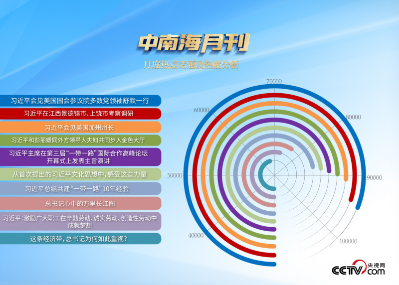 央視網(wǎng)“智聞”系統(tǒng)提取分析10月全網(wǎng)時政新聞熱點顯示,“習近平主席會見美國國會參議院多數(shù)黨領(lǐng)袖舒默一行”“習近平會見美國加州州長”“習近平主持召開進一步推動長江經(jīng)濟帶高質(zhì)量發(fā)展座談會”等話題最受網(wǎng)民關(guān)注。