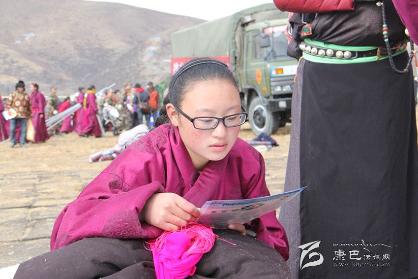 安置點(diǎn)小姑娘認(rèn)真翻看藏漢雙語健康宣傳資料。