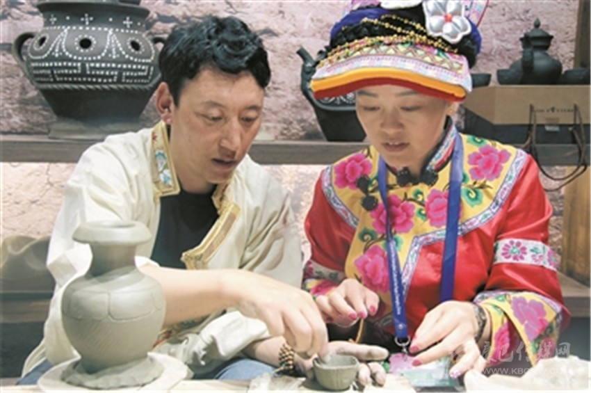 游客向非遺傳承人學(xué)習(xí)阿西土陶制作工藝。