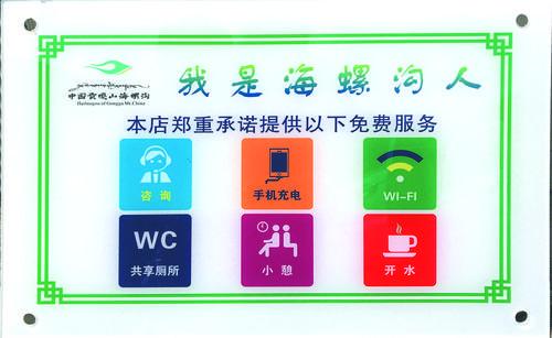 “我們長征大酒店在提高服務質量的同時也掛了這個牌子,我們承諾為客人提供免費的開水、充電、共享廁所等服務,讓客人對海螺溝有一個美好的印象,在海螺溝過的開心愉快?!遍L征大酒店負責人楊德黎說。