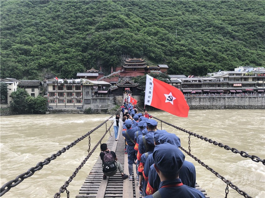 10月29日,瀘定橋一如既往地?zé)狒[,深秋微風(fēng)襲來(lái),粗壯鐵鏈和結(jié)實(shí)木板構(gòu)成的橋身輕晃,到此參加“不忘初心、牢記使命”主題教育的黨員干部們擎著黨旗,身著紅軍服,踩著當(dāng)年紅軍的腳步在橋上走過(guò)。