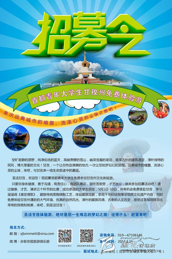 本網(wǎng)訊(本網(wǎng)記者)為進(jìn)一步宣傳展示甘孜州的康巴文化積淀與旅游特色,州委、州政府將舉辦“圣潔甘孜,走進(jìn)北京”的文化旅游周宣傳活動,在宣傳周前期推出了一個亮點活動,就是面向首都各高校公開招募一批青年大學(xué)生赴甘孜州體驗生活,讓他們走出都市,感受生態(tài)甘孜的藍(lán)天白云,感悟和諧甘孜的幸福文明,以他們的親身經(jīng)歷為樣本案例,見證新甘孜的獨特魅力。