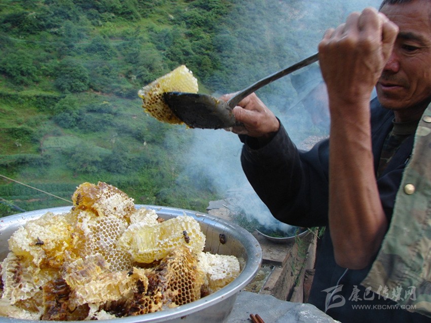 這時(shí)候,一位城里人開著車來到他家里,前來購(gòu)買蜂蜜。蘭友才提著火爐,在里面撒上柏樹枝椏,打開蜂箱蓋子后,將煙霧吹進(jìn)蜂箱里。不一會(huì)兒,蜜蜂們紛紛飛出巢穴,在幾十米開外不停的飛翔、徘徊,只留下滿箱雪白的蜂蠟一排排整齊的豎立在那里。蘭友才拿出一把刀,輕輕地在蜂蠟上割取,并迅速將浸滿琥珀色糖液的蜂蠟放進(jìn)瓷盆里。蘭友才告訴我,蜂蠟的上半部分為蜂蜜,下半部分是蜂蛹的巢穴,因此只割取上半部分。