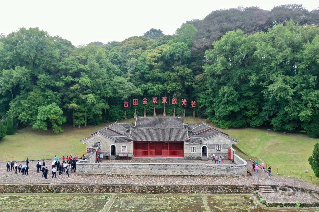 游客在福建省龍巖市上杭縣古田鎮(zhèn)古田會議會址參觀(2021年5月9日攝,無人機照片)。新華社記者姜克紅攝